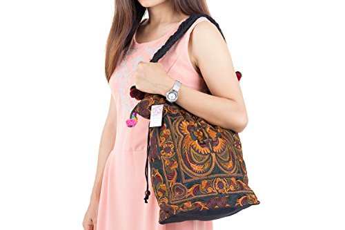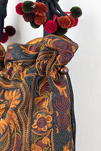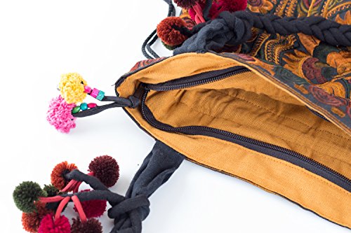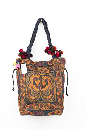 -. Feature : Material : 100% Cotton, Fabric, Pompoms , Zip / N.B. YOU MAY NOT RECEIVE THE EXACT BAG PICTURED HERE, AS THE FABRIC DESIGN MAY VARY SLIGHTLY FROM BAG TO BAG. THE EMBROIDERED CLOTH IS NEVER DUPLICATED. THIS MAKES EACH BAG UNIQUE AND SPECIAL, BEING EMBROIDERED BY EACH INDIVIDUAL ARTISAN. / Zip :Pompoms on zip. / Zip : This bag has an outside zip closure and inside pocket with zip. / Approximately Length:13" (INCH) Height:14" (INCH) Handler:24" (INCH)