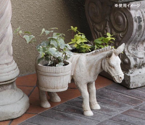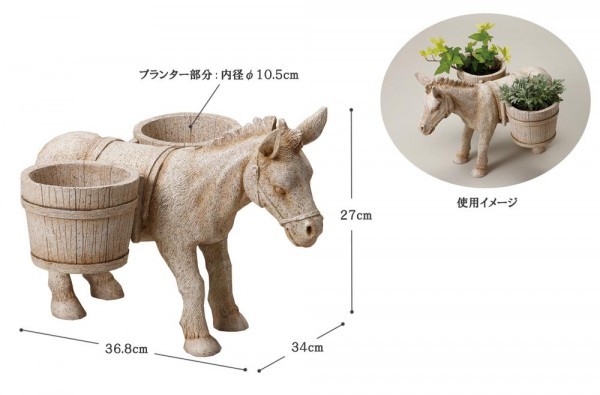 シャビーな風合いは、フレンチテイストのガーデンにぴったりです。 製造国:中国 素材・材質:レジン 商品サイズ:34W×36.8L×27Hcm(プランター部分:内径Φ10.5cm) 重量:2600g 仕様:水抜き穴あり(ポリ栓付) ※サプライヤー直送品 ご注文後3~4営業日後の出荷となります【商品名】セトクラフト ブロカントオーナメント(ロバ)SR-0416