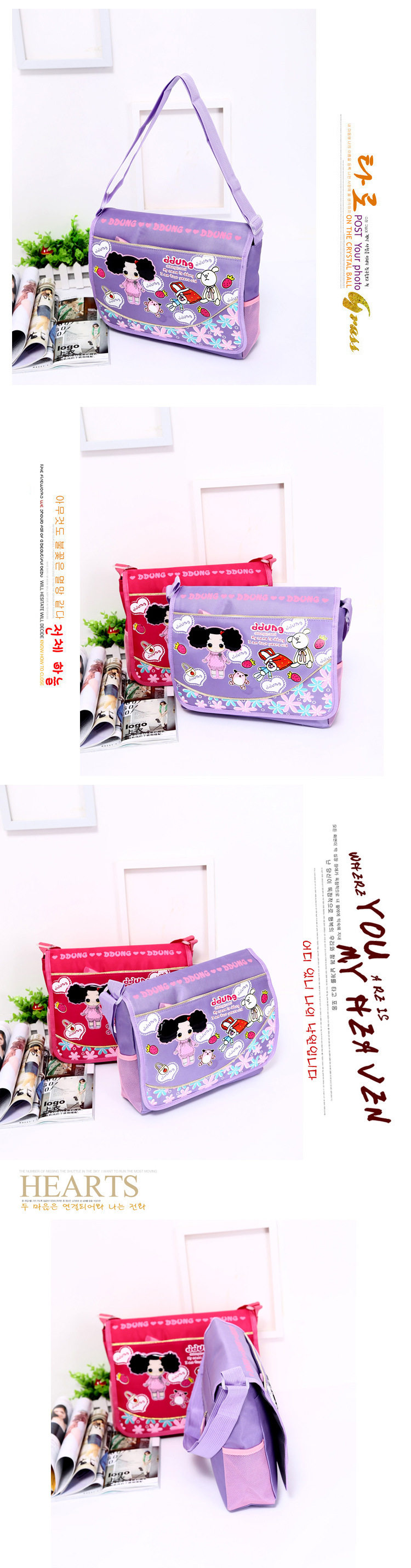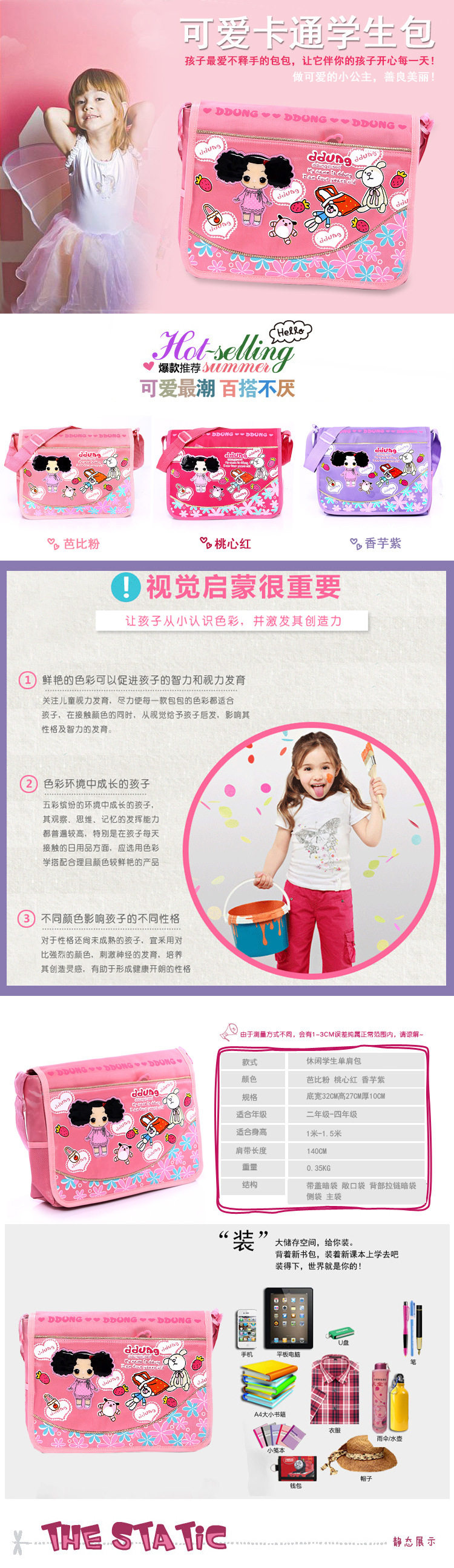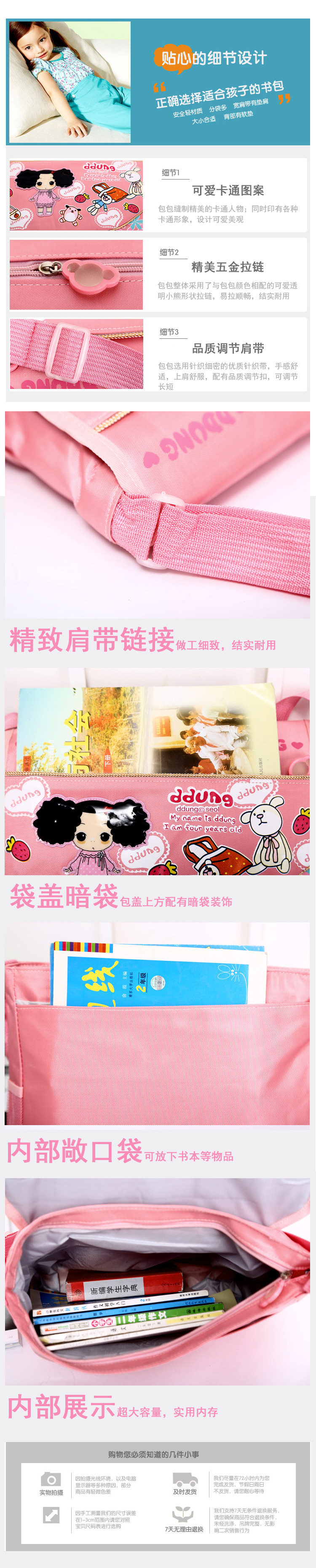 Product Overview 1 main bag front flap pockets +1 +1 +1 the back zipper pocket inside zipper pocket, patterned thermal transfer printing technology, lasting not fade; high strength plastic buckle, strap quality thick, high-quality in cloth, lovely shape zipper.