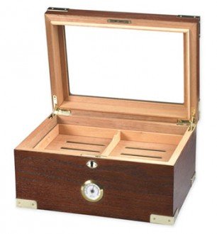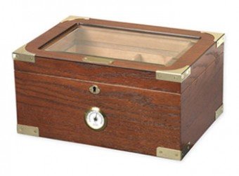 Studio : Quality Importers Publisher : Quality Importers Product Description Holds up to 100 Cigars 1 Round Humidifier 1 Front Mount Glass Hygrometer with Brass Frame SureSeal Technology Insures Proper Lid Seal on Closure Spanish Cedar Tray with Divider 2 Dividers at Bottom Lined with Premium Kiln Dried Spanish Cedar Gold Plated Lock Key with Tassel and Hidden Quadrant Hinges Gold Plated Top and Bottom Corner Hardware Engraveable Brass Nameplate Macintosh Oak with Walnut Finish Capacity: 75-100 Cigars Dimensions (Outside): 13 5/8" W x 9 1/2" D x 6 1/4" H 0