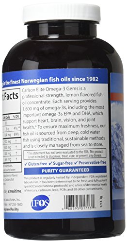 Carlson Elite Omega-3 Gems is a professional-strength, fresh fish oil concentrate. Just one serving contains 1,600 mg of omega-3s, including EPA and DHA which promote heart, brain, vision, and joint health. To ensure maximum freshness, we closely manage our omega-3 fish oil supplements from sea to store. We source the highest quality, deep, cold water fish using traditional, sustainable methods. The same day they're caught, our fish are transported to a highly-regulated Norwegian facility for processing and purification. The fresh fish oil is placed in soft gels, while the rest of the fish is used for human and animal consumption, so no part of the fish is wasted.Feature