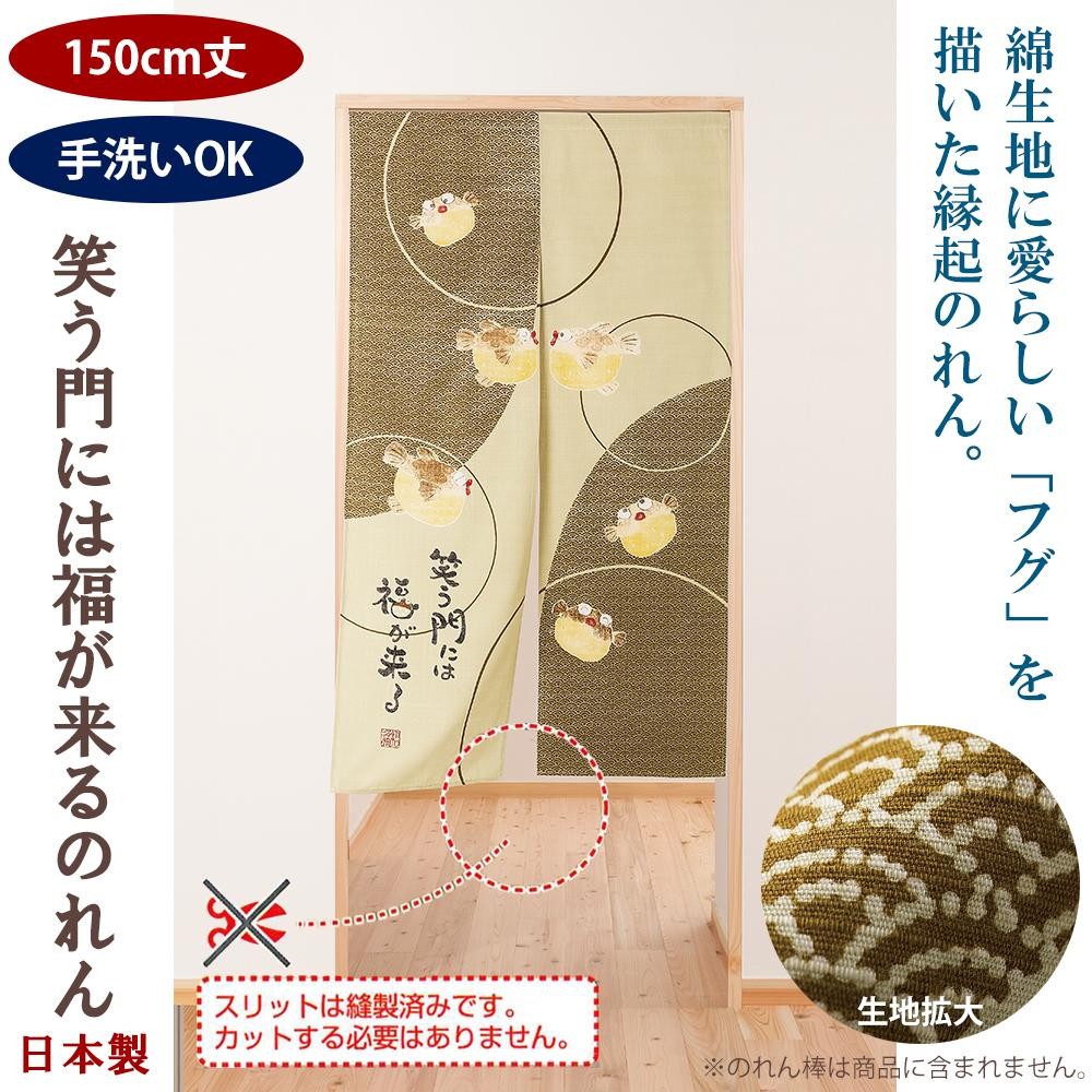 綿生地に愛らしいフグを描いた縁起のれんです。 製造国:日本 素材・材質:綿100% 商品サイズ:(約)幅85×高さ150cm 重量:(約)225g 仕様:手洗いOK(洗濯機洗い不可)タンブラー乾燥禁止 ※サプライヤー直送品 ご注文後3~4営業日後の出荷となります【商品名】笑う門には福が来るのれん 日本製