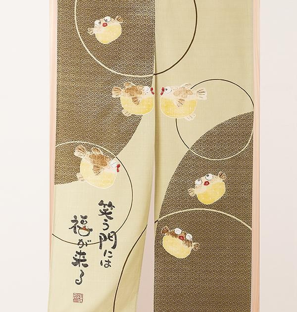 綿生地に愛らしいフグを描いた縁起のれんです。
