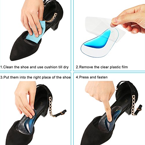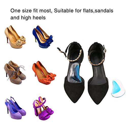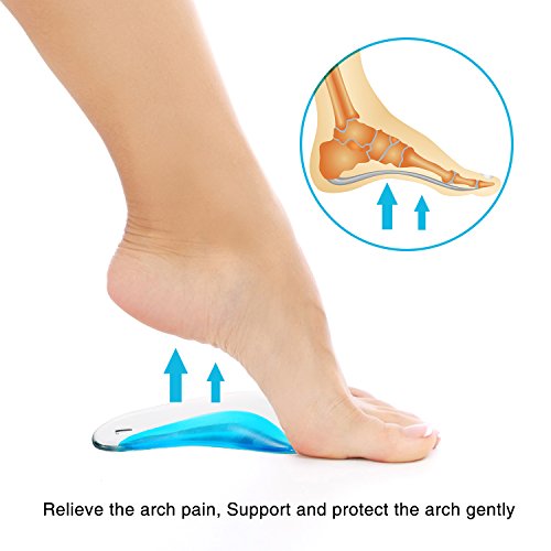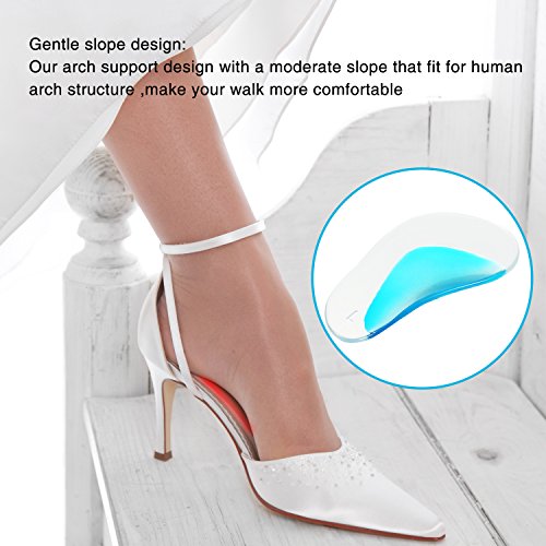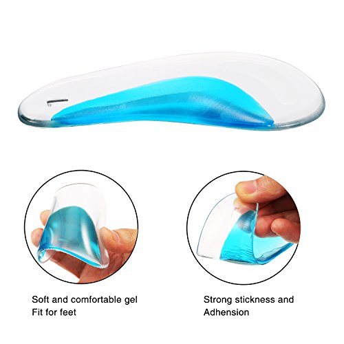 Features: The arch support cushions are made of soft and durable polyurethane gel material, they are efficient pads to relieve pain and pressure; And they can be applied repeatedly after washing. Proper design: In light of human arch structure, we upgraded our arch support with a more moderate and higher slope for giving feet more support to make you more comfortable when walking or standing. Useful arch support inserts: The arch support cushions are efficient to relieve pain and pressure related to Plantar Fasciitis, tendonitis, arthritis, high arch and other arch problems. Easy to use: Step 1. Test for correct placement in your particular shoe or boot. Step 2. Clean the place where you are ready to put arch support cushion, make sure there is no dust and water on the surface. Step 3. Place the insole into the shoe little by little, so that you can adjust until it is on the correct place. Step 4. After sticking, gently press it to confirm the stability, especially press the edge parts until there is no gap. Specification: Material: soft PU gel, soft velvet Color: transparent, blue and beige Size: 9.7 x 6 cm Quantity: 6 pairs Package includes: 6 x Pairs of arch support insoles 0