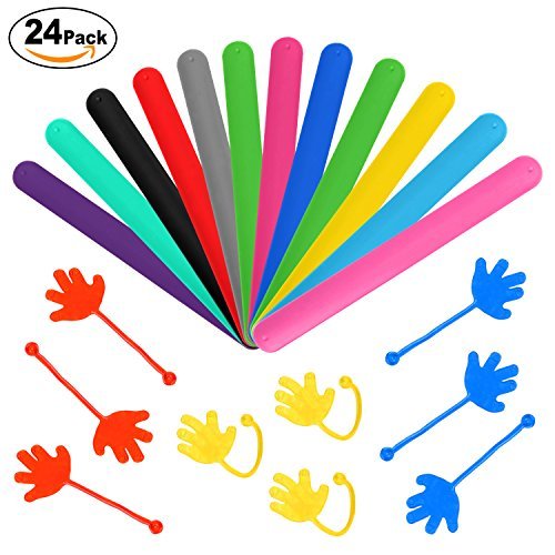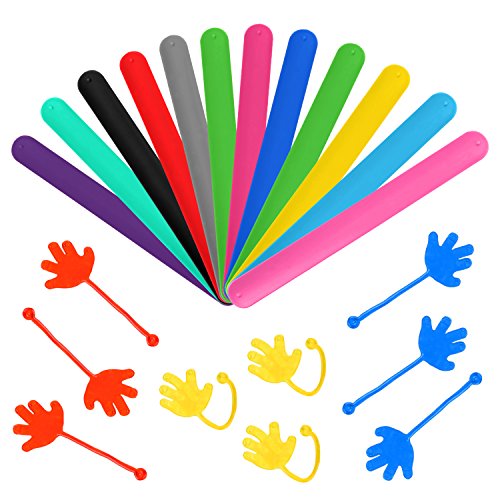 You will get 12 pieces of slap bracelets(10 colors) and 12 pieces of sticky hands