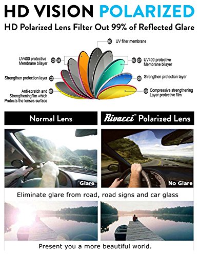 ✅ HIGH-PERFORMANCE! Rivacci TAC Polarized Lenses UV400 Protection provide significant glare reduction from reflected or scattered light. What that really means is these anti glare glasses will be an absolutely pleasure for driving, holiday fun, outdoor activities, sports, baseball, golf, fishing, summer, allowing you to feel more comfortable and safe under intense dazzling sun.