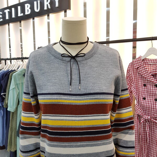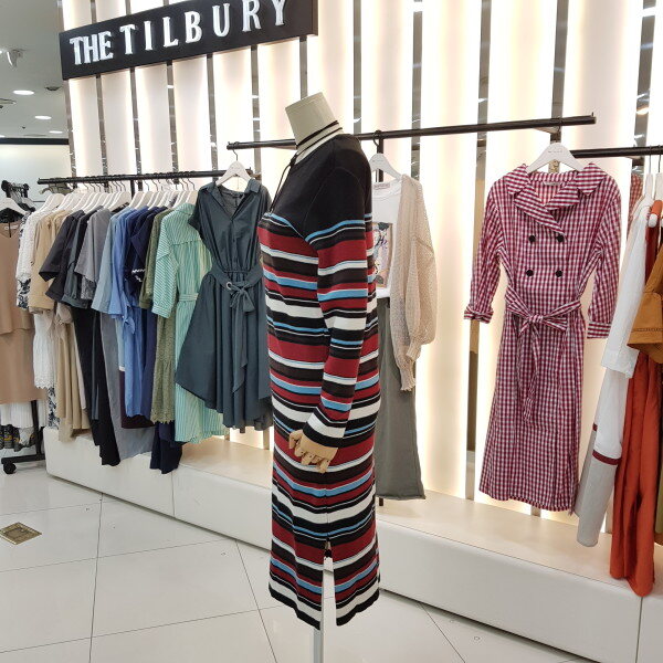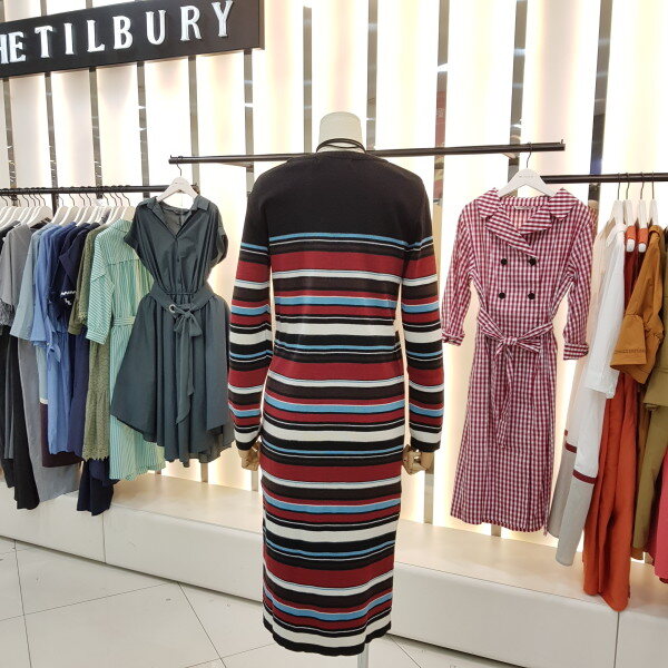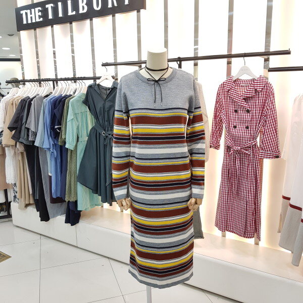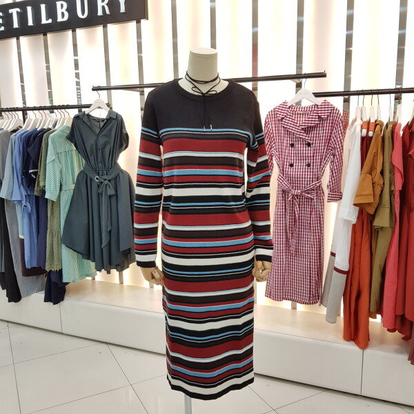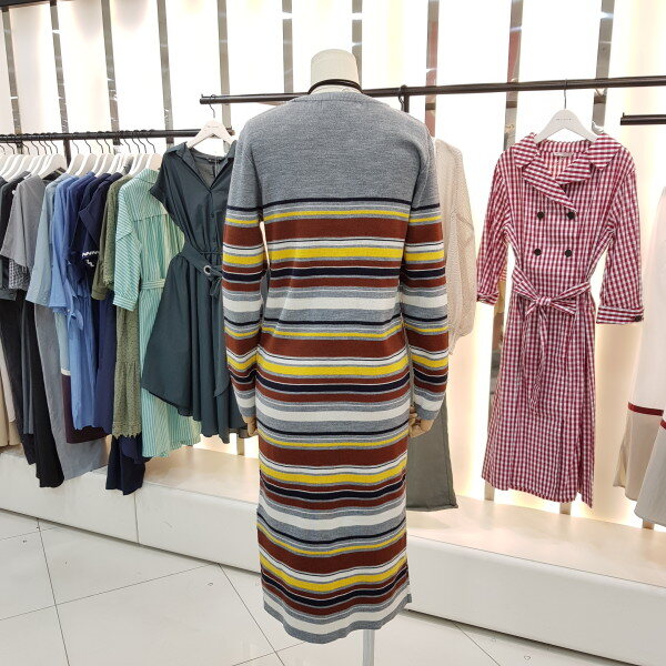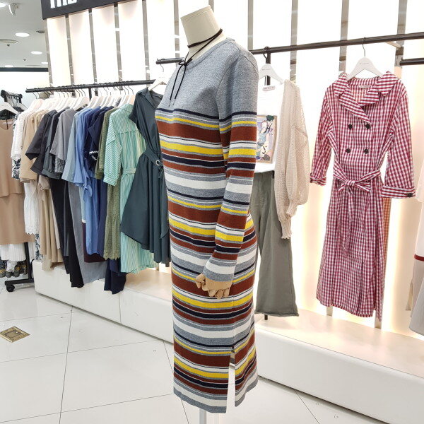 감각적인 컬러 배색이 돋보이는 스트라이프 패턴의 니트소재 원피스 입니다.편안하고 소프트하게 착용가능합니다.바디라인에 적당히 피팅되어 슬림한 실루엣을 연출할수있습니다.
