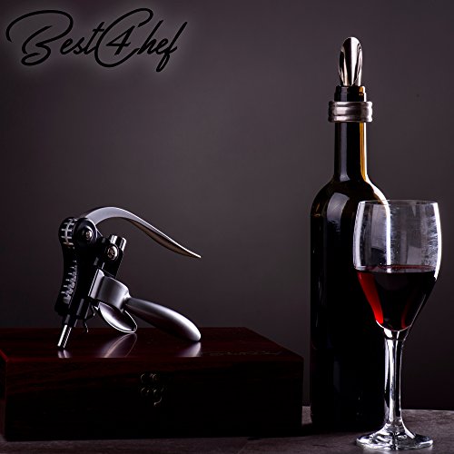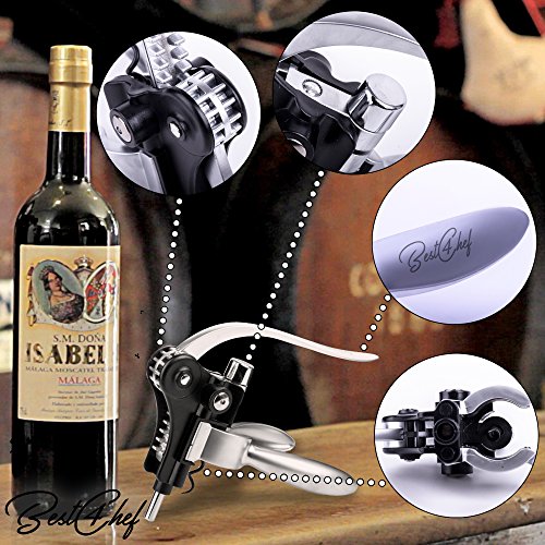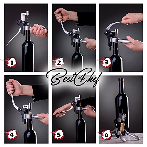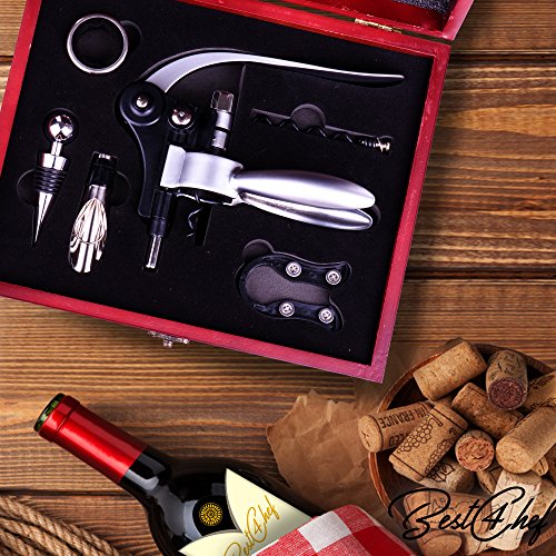 Product Description This luxury 6-piece rabbit-style corkscrew wine bottle opener package is unparalleled in its quality stainless steel construction, chrome finish and superior design. Durable and easy to use, the fashionable black-and-silver corkscrew opener, wine stoppers, drip ring, wine foil cutter and extra corkscrew worm/spiral create a superb addition to your home kitchen or bar collection, as well as a unique gift idea. The premium real cherry wood box makes it perfect for gift-giving or storing at home or office. Offer as a present at your next wedding or party; give as a gift for family and friends. With the enclosed recipe ebook BONUS, you're sure to be the talk of the party! For a risk-free purchase, there's a 30-day guarantee to ensure your complete satisfaction - or your money back! 0