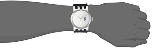 Mineral crystal; brushed stainless steel case; black silicone strap