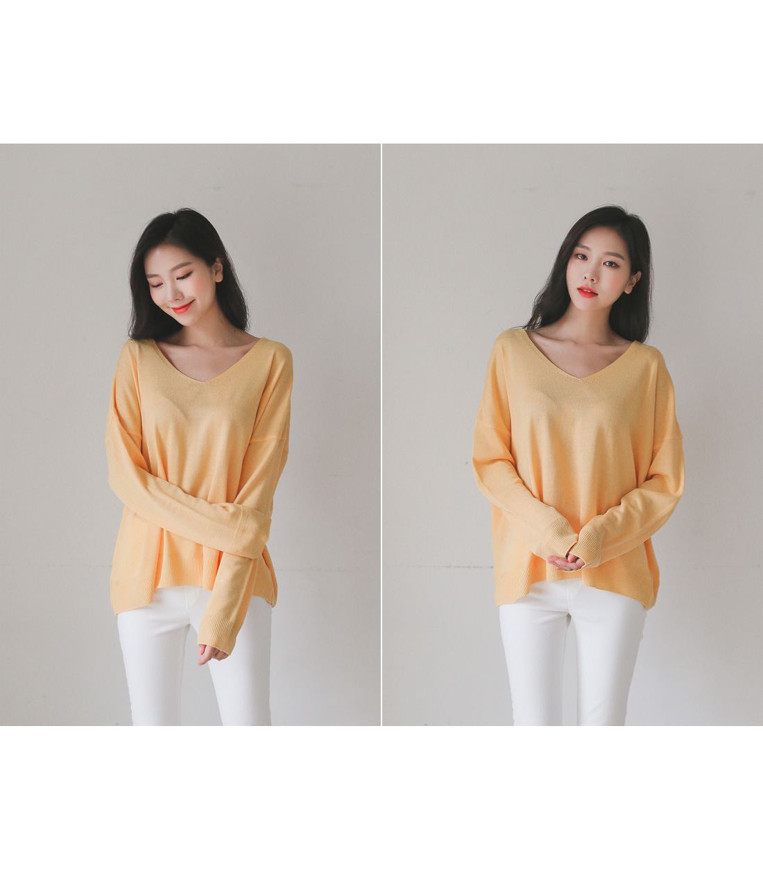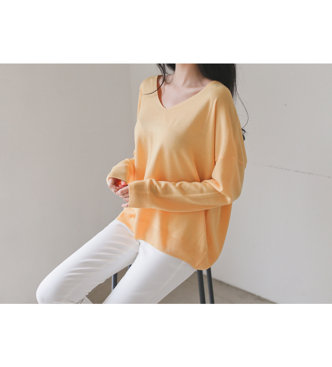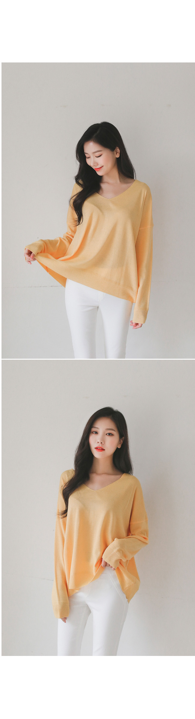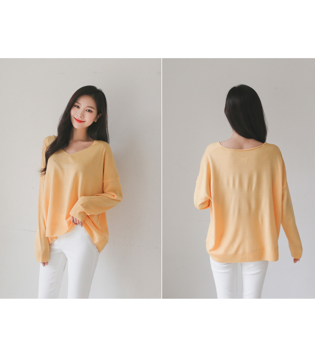 적당한 깊이의 브이넥으로 갸름해보이는 페이스라인!