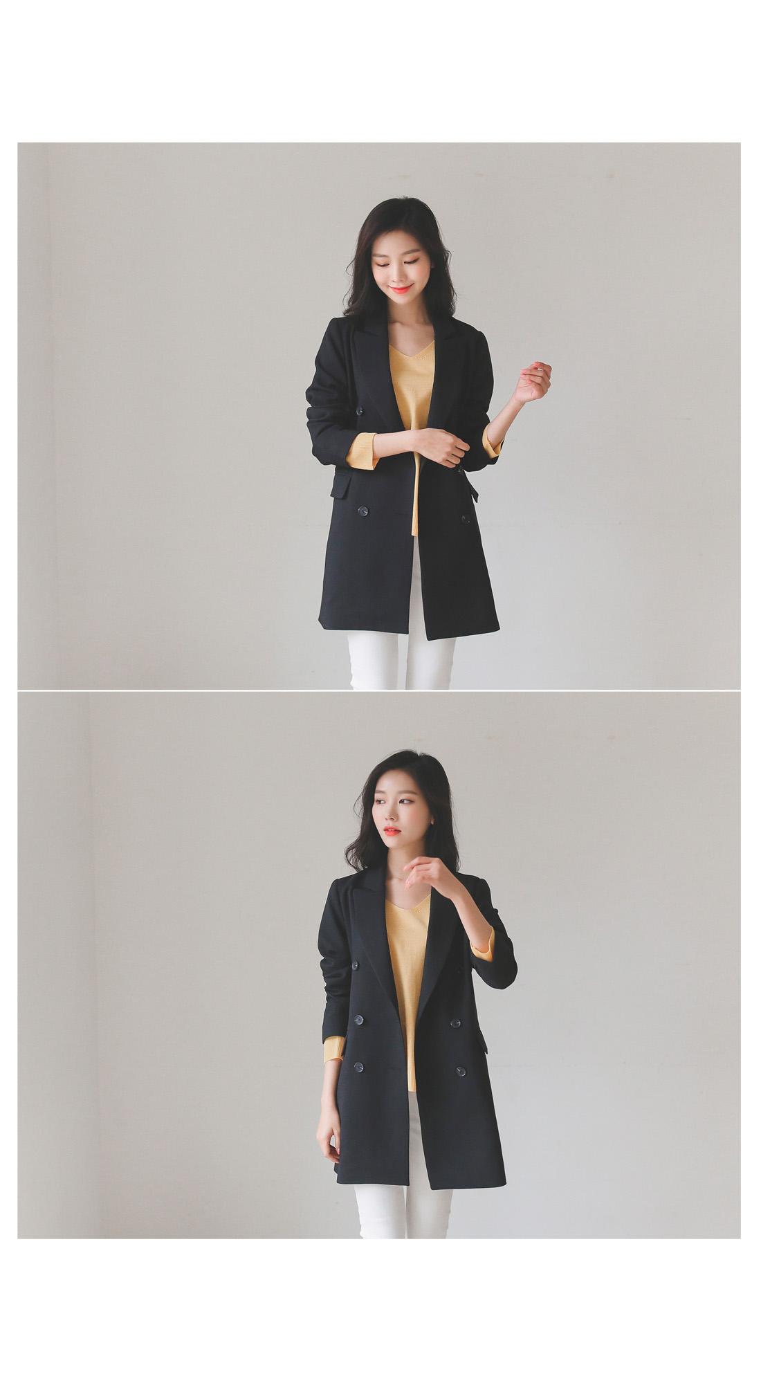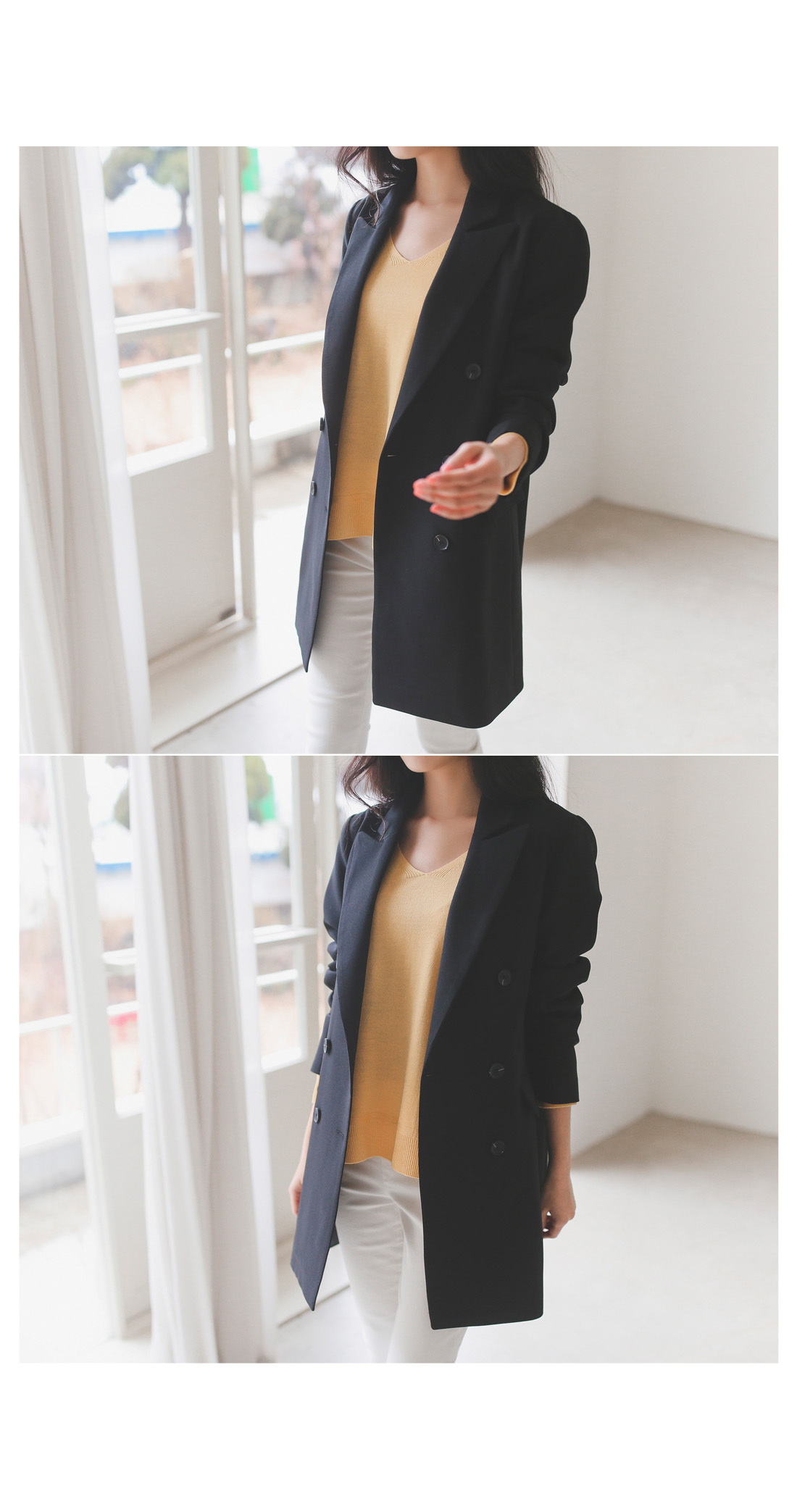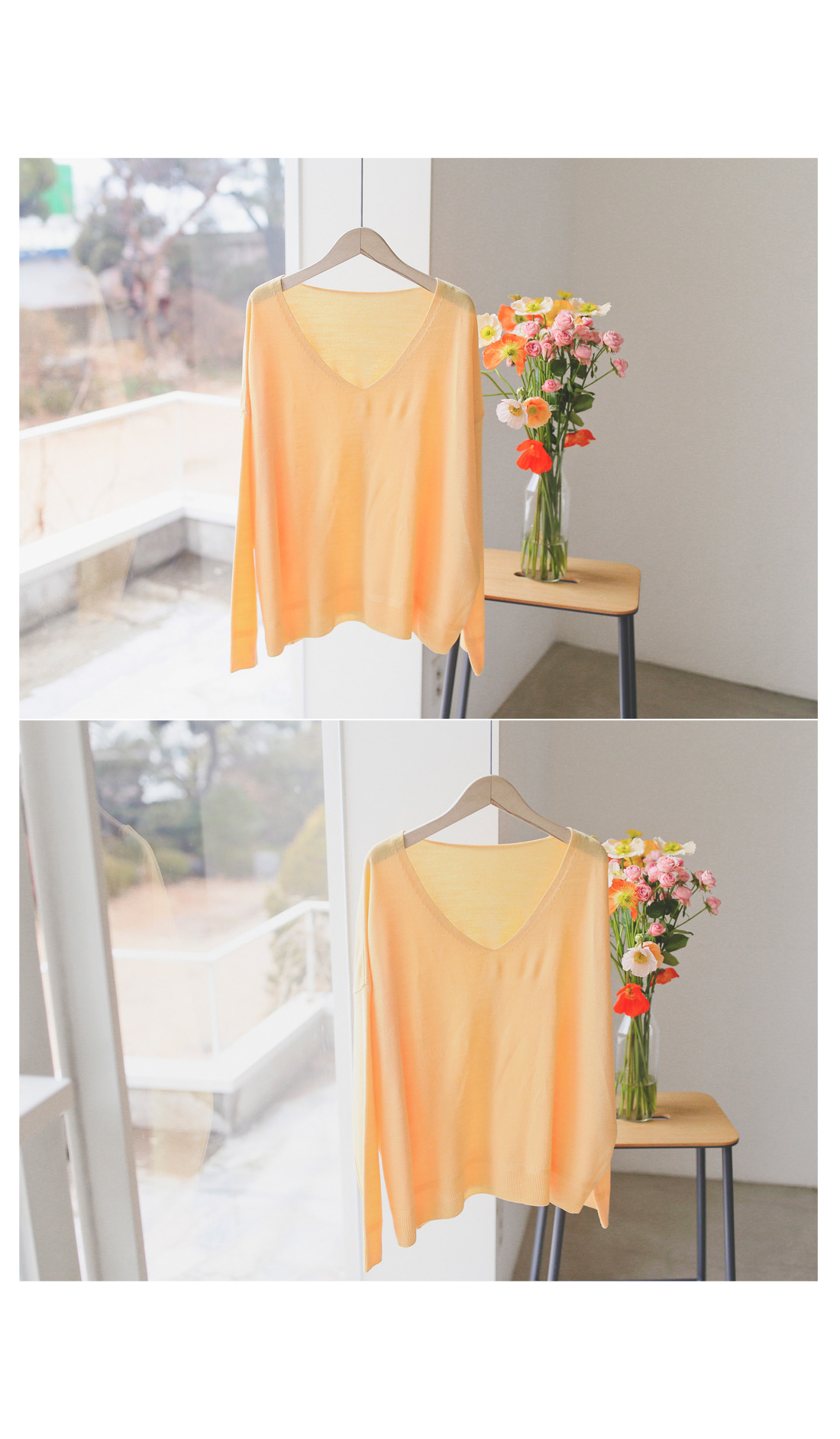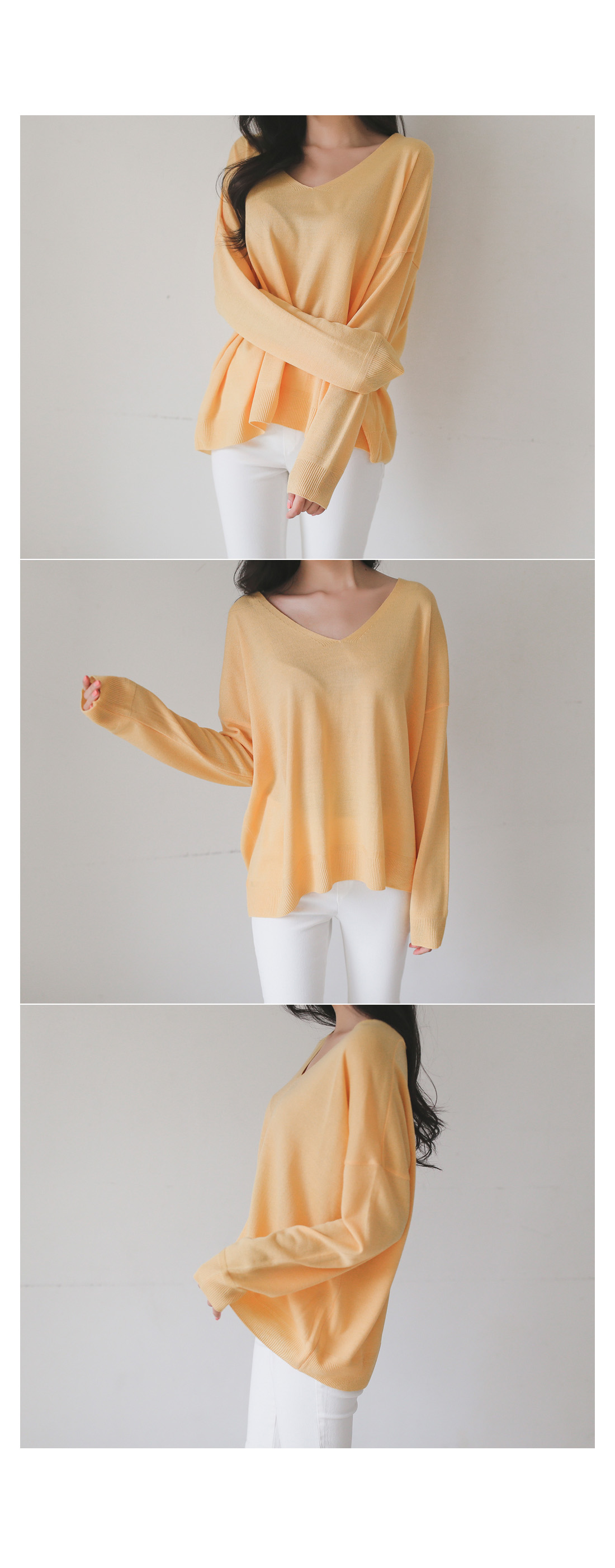 적당한 깊이의 브이넥으로 갸름해보이는 페이스라인!