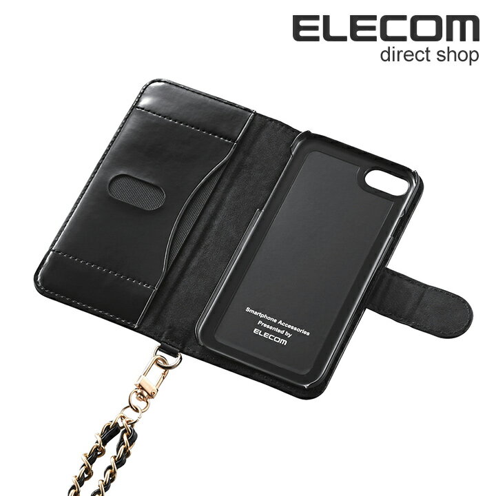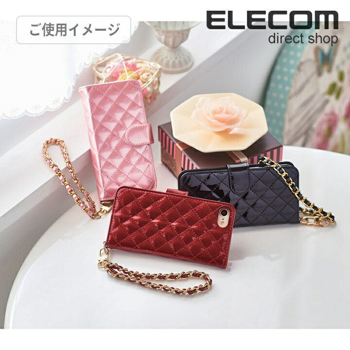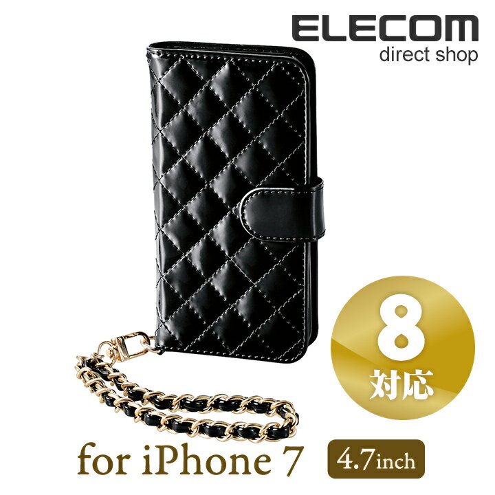 ■キルティング加工を施したエナメル生地とゴールドチェーンで、高級感あるゴージャスなたたずまいが魅力のiPhone 7iPhpne 8用ソフトレザーケース(手帳型)です。
