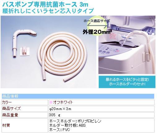 バスポンプのための軽~いホースです。抗菌剤入りで清潔・安心!ラセン芯が弾んで腰折れしにくく、軽くて潰れにくいから水がよく通る♪ホースホルダーつきで、洗濯機横にホースをセット。浴槽への逆流を防ぐ効果もあります。各メーカーのバスポンプにお使いいただけます。※サイズが合っていることをご確認ください。 ※サプライヤー直送品 ご注文後、当日~1営業日後の出荷となります【商品名】バスポンプ抗菌ホース3m BP-46
