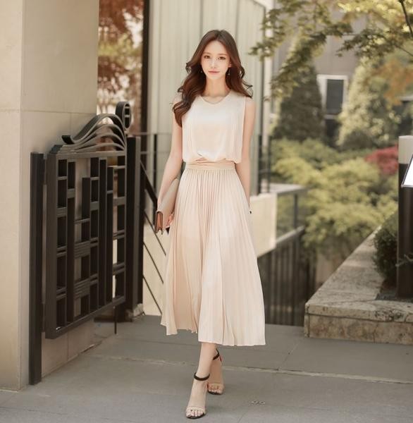 ソリッドカラーシフォン ノースリーブベスト プリーツスカートワンピース ベージュ/XL