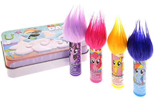 Our My Little Pony lip balm is so much fun, your girls will have a blast showing their sparkly style! With four tubes of fabulous flavored gloss and a decorative tin, all sporting different characters from the movie, this moisturizing lip gloss will be a big hit. See bullets and images for more information.
