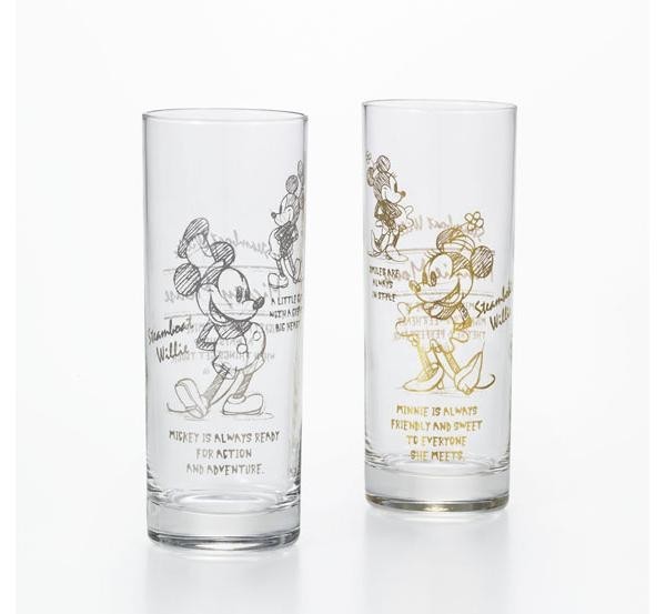 ミッキーの映画デビュー作「スチームボートウィリー」をテーマにしたスタイリッシュなストレート形状のグラスです。プラチナ&ゴールドカラーでミッキー&ミニーのスケッチ風アートをあしらいました。シックで高級感のあるデザインなので、幅広いシーンで活躍できます。ギフトにも最適です。 |