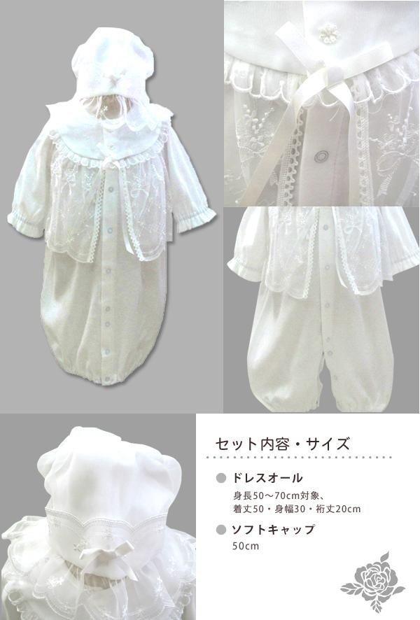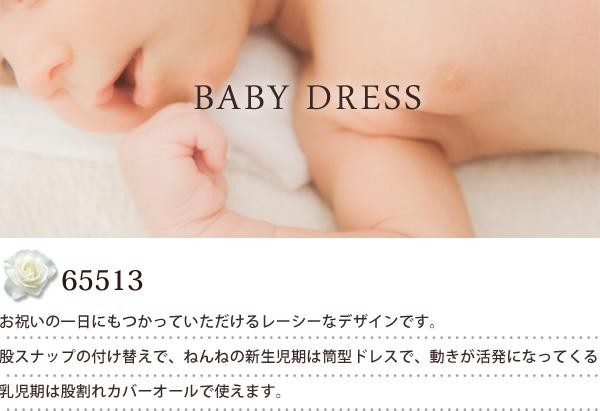 | お祝いの一日にもつかっていただけるレーシーなデザインです。股スナップの付け替えで、ねんねの新生児期は筒型ドレスで、動きが活発になってくる乳児期は股割れカバーオールで使えます。 |