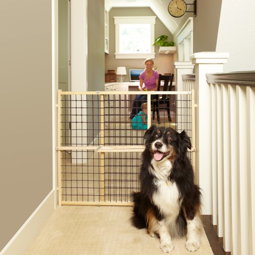 The North States Extra-Wide Wire Mesh Pet gate is specially designed for wide openings. The gate pressure mounts easily and securely without the use of hardware. Simply position and lock in place. The sturdy hardwood frame surrounds rigid vinyl-coated brown wire mesh panels, which adjust to fit openings 29.5 to 50 Inch wide and is an extra-tall 32 Inch high. The side bumpers on the hardwood frame are neutral in color and will not mark walls. Want to use this gate with your child? No problem. This gate is certified by the Juvenile Products Manufacturers Association (JPMA) for use with children ages 6 to 24 months of age. Safety and containment all wrapped up in one gate - how simple.