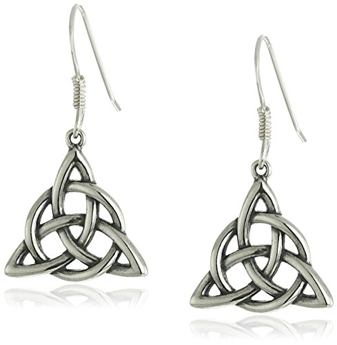 These sterling silver triangle knot earrings showcase a popular and beautiful Celtic design. Openwork triquetra knots are interlaced with circles and dangle below comfortable french hooks. With their intricate pattern and bright finish, these earrings are an eye-catching accessory.