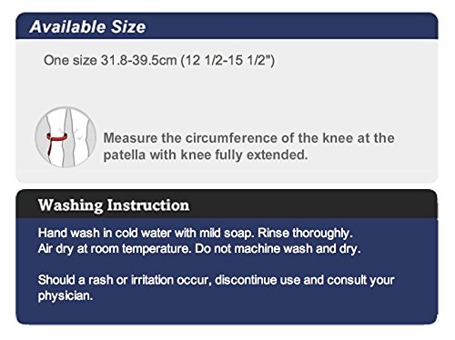 -. Feature : Hook and loop closure design fits most knee sizes. / Opening relieves pressure on patella. / Exclusive reinforced patella stabilizer prevents displacement. / Provides compression for weak or overstressed knee. / Hand wash in cold water with mild soap. Rinse thoroughly. Air dry at room temperature. Do not machine wash and dry.