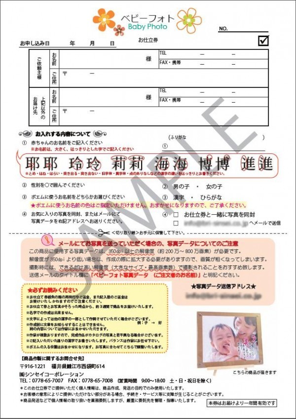 | 写真の上にお子様の名前をもとにしたポエムをかわいく手書きします。ご自宅用、ご両親へのプレゼント用としてもぴったりです☆ |