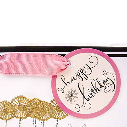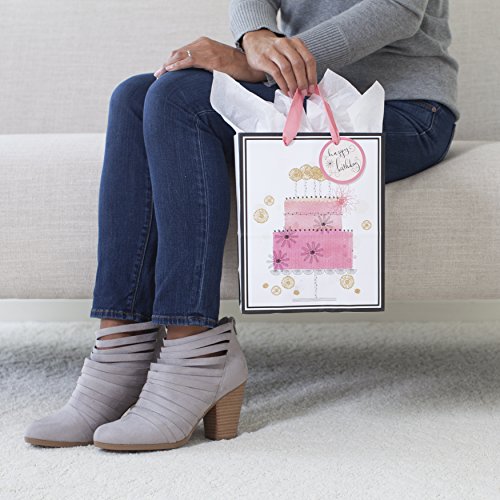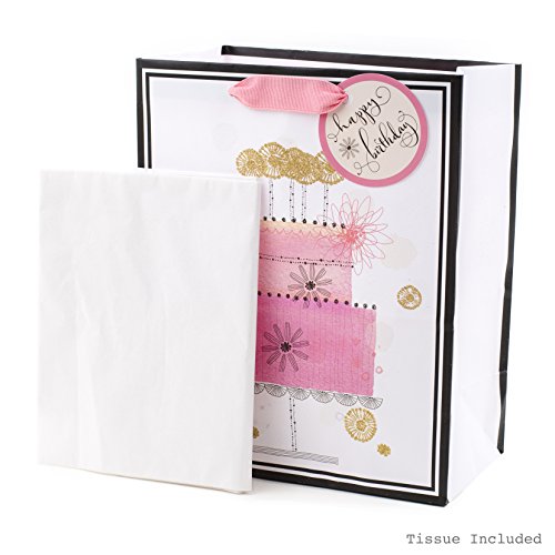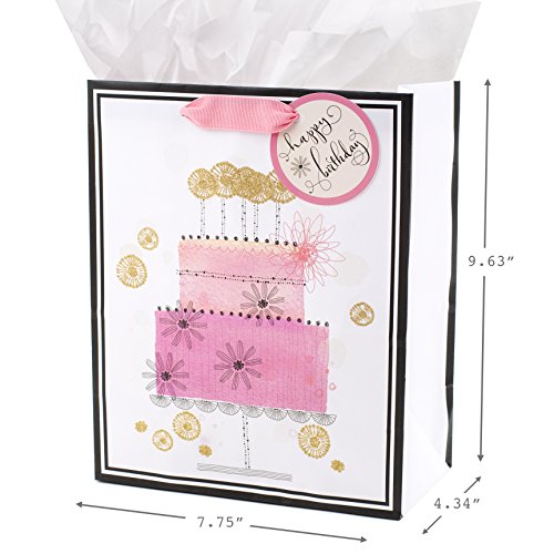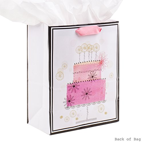 Studio : Hallmark Publisher : Hallmark Binding : Kitchen Product Description This white gift bag features a festive design with a two tiered pink cake on cake stand with candles, black line border, and glitter accents that add extra sparkle. It comes complete with a gift tag that reads "Happy birthday," a pink grosgrain ribbon handle, and coordinating white tissue paper. It can hold candles, figurines, a scarf, standard sized book, video game or DVD. Purchase includes one large gift bag and 3 sheets of white tissue paper perfect for any friend, relative, or coworker for a birthday celebration. This medium-sized gift bag measures 7.75 inches wide by 9.63 inches high by 4.34 inches deep inches. Created with high-quality paper materials, all Hallmark gift bags are made with paper from well-managed forests. 0
