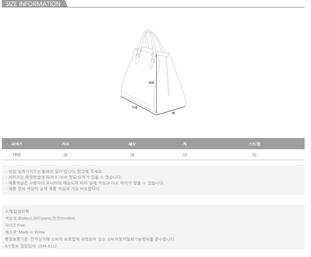 일러스트 포인트 백 #84754 MD COMMENT가방 전면에 있는 일러스트가 포인트가 되는 백 소개할게요~캐주얼한 디자인으로 어떤 옷에도 가볍게 들기 좋아요!또한 넉넉한 사이즈로 여행 가방으로 활용해도 좋아요:)강렬한 일러스트 디자인이 매력적인 백으로데일리하게 혹은 휴가지에서 들기 좋아 추천드릴게요~COLORSIZE TIP컬러는 도쿄파리런던 3color로 구성되어 있으며 모델의 착용 컬러는 도쿄 입니다.