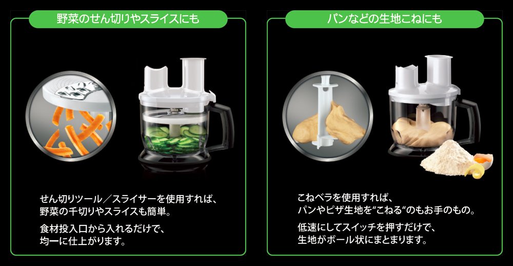 With one touch exchange of attachment, wide usage of "crush" "mixing" "whisk" "quill" "slice" "shredded" "knead" possible