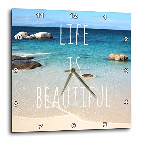 Life is Beautiful - Positive affirmations - Inspiring nature - Beach photography - words saying Wall Clock is a wonderful complement to any room in your home or office. Made of durable high grade aluminum. This frameless clock has a high gloss mirror like, UV coated, scratch resistant finish and is suitable for a moist environment. Sizes available range from 10" x 10" to 15" x 15". Requires one AA battery; not included. Battery box is not covered.Feature