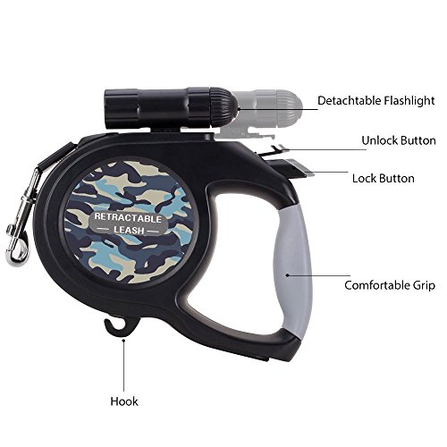 Practical Design --- a reliable Button Brake & Lock is flexible to adjust the length of the leash to stay an appropriate length you need; More comfortable experience would be given by the ergonomic handle grip design with internal cozy cushion attached, which could also prevent hurting by the tape; An extra hook included in the leash offer an approach to take pet tools.