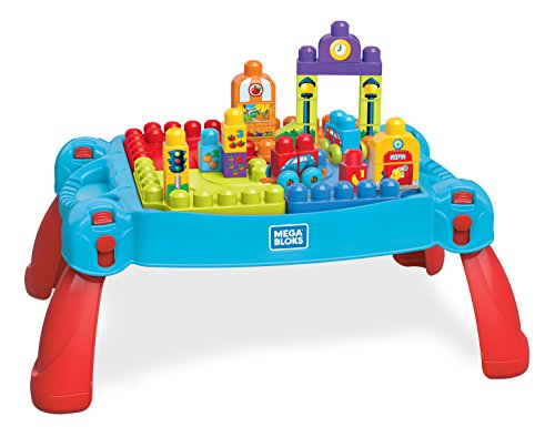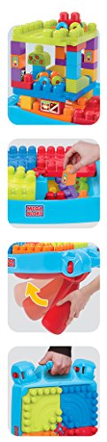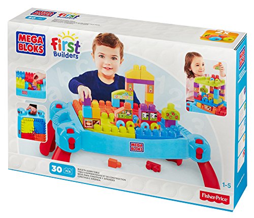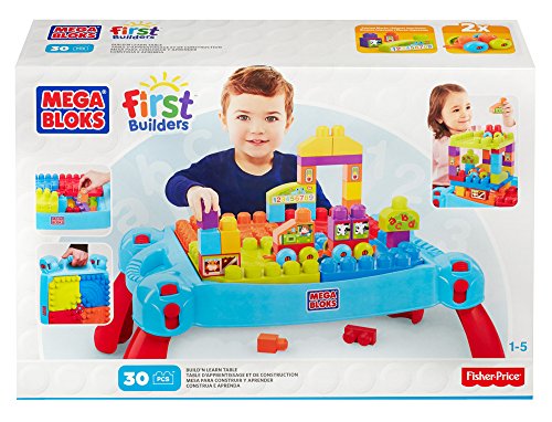 Learn, play and explore with the Build 'n Learn Table by Mega Bloks! Totally portable, this convenient table makes for a snappy platform where your child can start to learn through independent play and interactive discovery. Using the included specially printed First Builders blocks, your child can build directly onto the table, creating almost anything they can imagine. Build and stack onto the included wheelbases and use the tabletop track to zoom around and around for lots of speedy fun! Ideal for families on the go, the Build 'n Learn Table by Mega Bloks folds up for easy travel and features interior storage for blocks. Ideal for ages 1 to 5.Feature