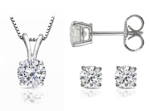 PARIKHS Round Cut Diamond Solitaire Pendant & Diamond Stud Set in Popular Quality (Color - JKLM, Clarity - I2) 0.07ct, hand-set in New York City with 10K White Gold 4 prong friction back setting. Packaged into a fabulous box for your storing pleasure. Each and every Diamond is verified Conflict free Diamonds. PARIKHS offers a wide variety of selection in Diamond Stud, Pendant and Set. From our Privilege to Popular quality there is a stud, pendant or set to suit everyone's need. If not satisfied for any reason, you may return it to us for a full refund within 30 days.Feature