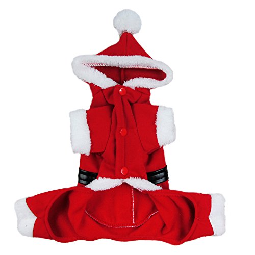 -. Feature : The dog Santa costumes make your puppy more attractive. / The pet Xmas coat is made of soft cotton and polyester material,comfortable and easy to wash. / Four-legged design with elastic waist, keep your pets warm,easy to wear and take off. / It is for Christmas family photos, parties, holidays and daily wear.