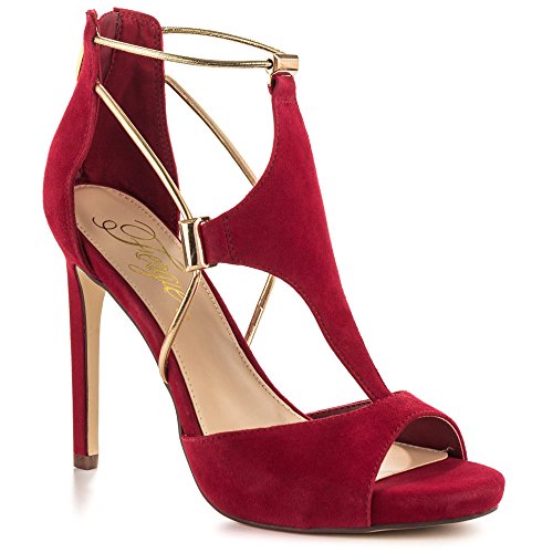 The Raegan sandal is both festive and elegant, with contrasting gold hardware and metallic gold cords complementing the T-strap design. A back-zip and sky-high 4 1/4-inch stiletto heel finish the look.