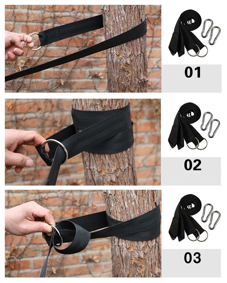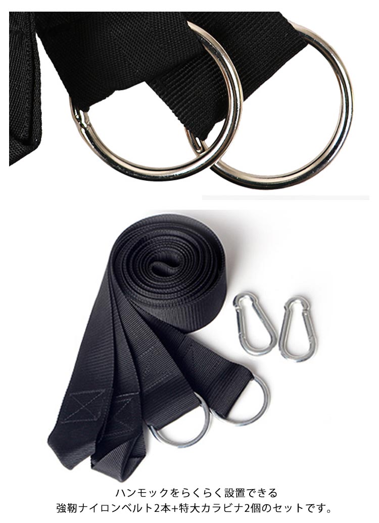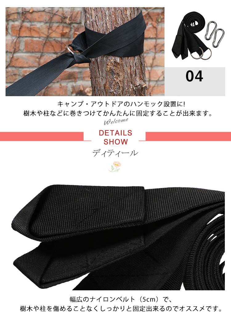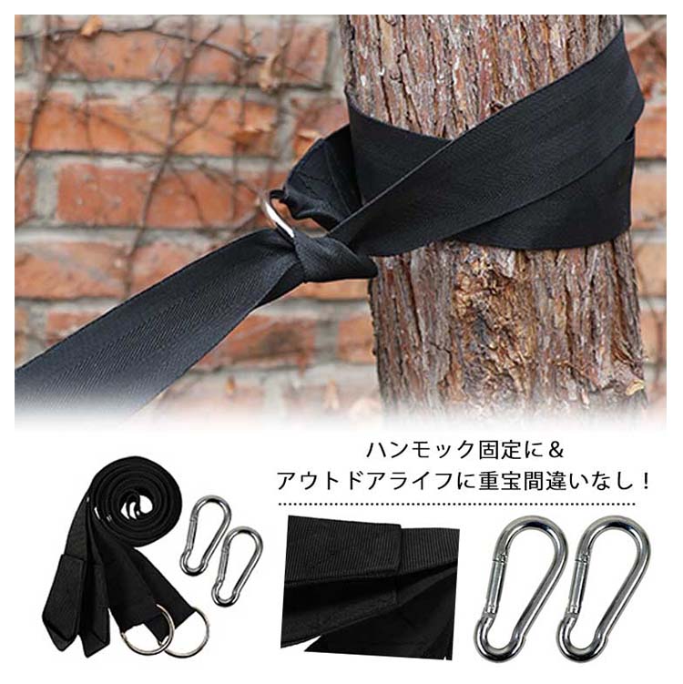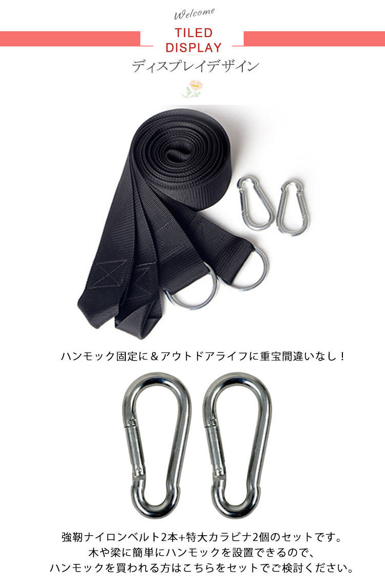 | ハンモック固定に&アウトドアライフに重宝間違いなし!強靭ナイロンベルト2本+特大カラビナ2個のセットです。木や梁に簡単にハンモックを設置できるので、ハンモックを買われる方はこちらをセットでご検討ください。 | |