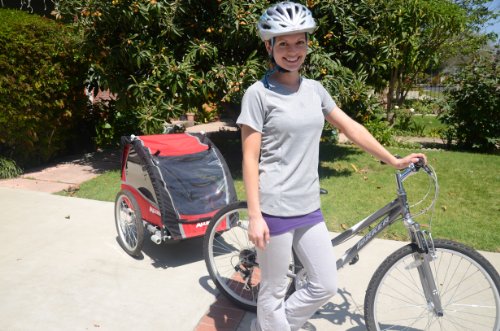 - Feature : 2-child bicycle trailer with lightweight aluminum frame / 20-inch inflated rear wheels and foot bed insert for comfort / Large front and side windows; safety harness and flag / Converts to stroller via adjustable handle and swiveling front wheel / Holds up to 2 kids (50 pounds each); comes with universal coupler