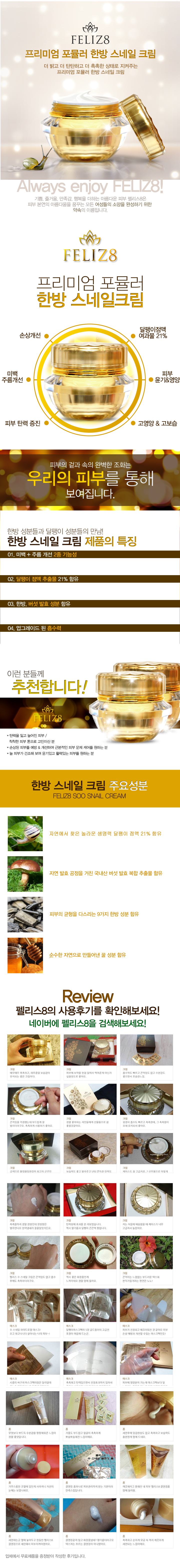 - 주요성분 달팽이 점액 여과물 (21) 피부 손상 개선에 도움 국내산 약용 버섯 발효 복합 추출물 항산화 효과에 도움 9가지 한방 성분 (의이인추출물 석류추출물 은행잎추출물 마치현추출물 지황추출물 삼백초추출물 어성초추출물 상백피추출물 당귀추출물) 건강한 피부 균형 꿀 유효 성분 효과 극대화 및 피부 윤기에 도움