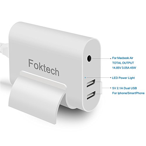 45W MacBook Air Charger with 2 USB Ports- You can charge your Iphone Ipad,Samsung,Andriod Smartphones while charge your Macbook Air at the same time.