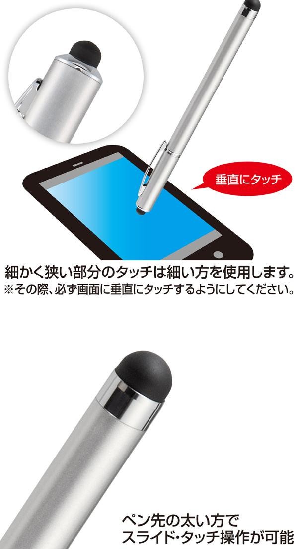 ペン先に柔らかい導電性シリコンゴムを使用し、快適な操作が可能です。上下両方にタッチペンがあり、太い側でスライド、細い側でこまかい部分のタッチと使い分けができます。 |