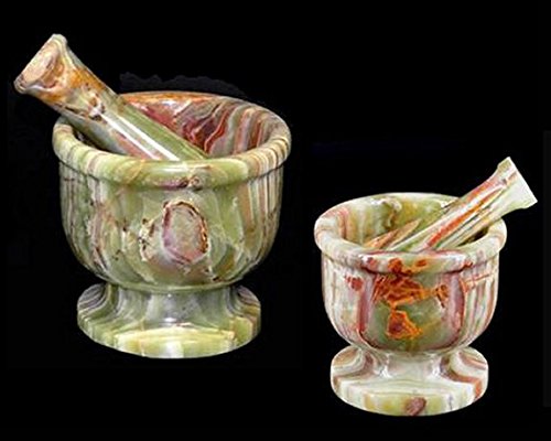 -. Feature : Decorative Green Onyx Mortar and Pestle Set - Small and Large - Set of 2 Pcs. / Beautifully Handcrafted from High Quality Genuine Onyx Gemstone - Each Unique Onyx Mortar and Pestle Set Blends Natural Banded Onyx Shades of Green, White, Honey, Brown and Burgundy Tones - Fully Polished for a High Gloss Finish / 2 Piece Set Includes: Large Mortar and Pestle Set - Mortar Bowl, 5 Inch Dia. x 4 Inch Tall / Small Mortar and Pestle Set - Mortar Bowl, 4 Inch Dia. x 3 inch Tall - Both Offer Thick Onyx Stone Mortar Bowls with Solid Stone Pestle for Crushing Herbs and Nuts, Grinding Spices, Blending or Mixing / Impressive Small and Large Stone Mortar and Pestle Sets for the Kitchen Counter, Decorative Marble Kitchen Accessories, and Unique Onyx Mortar and Pestle Gifts for Holidays or any Special Occasion / Our Stone, Onyx and Marble Mortar and Pestle Sets Available in Several Sizes. Khan Imports Offers Quality Onyx Gifts, Unique Marble and Stone Home Decor.