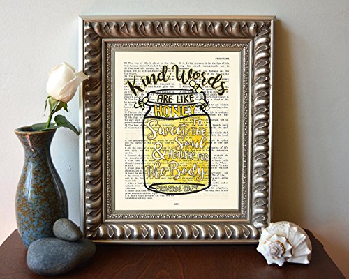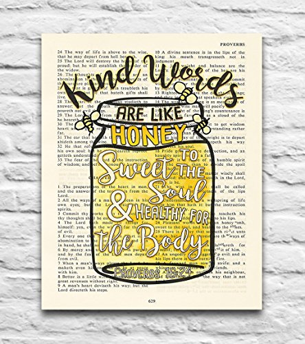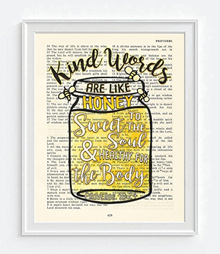 This 8x10 UNFRAMED reproduction print of a highlighted King James Bible scripture is sure to bring encouragement or hope to someone. We scan real pages from old Bibles (thus they have slight flaws and aging such as bleeding words from the other side, because the pages are so thin), which just adds to the character. The highlighted Bible page is in the King James version: "Pleasant words are as an honeycomb, sweet to the soul, and health to the bones."