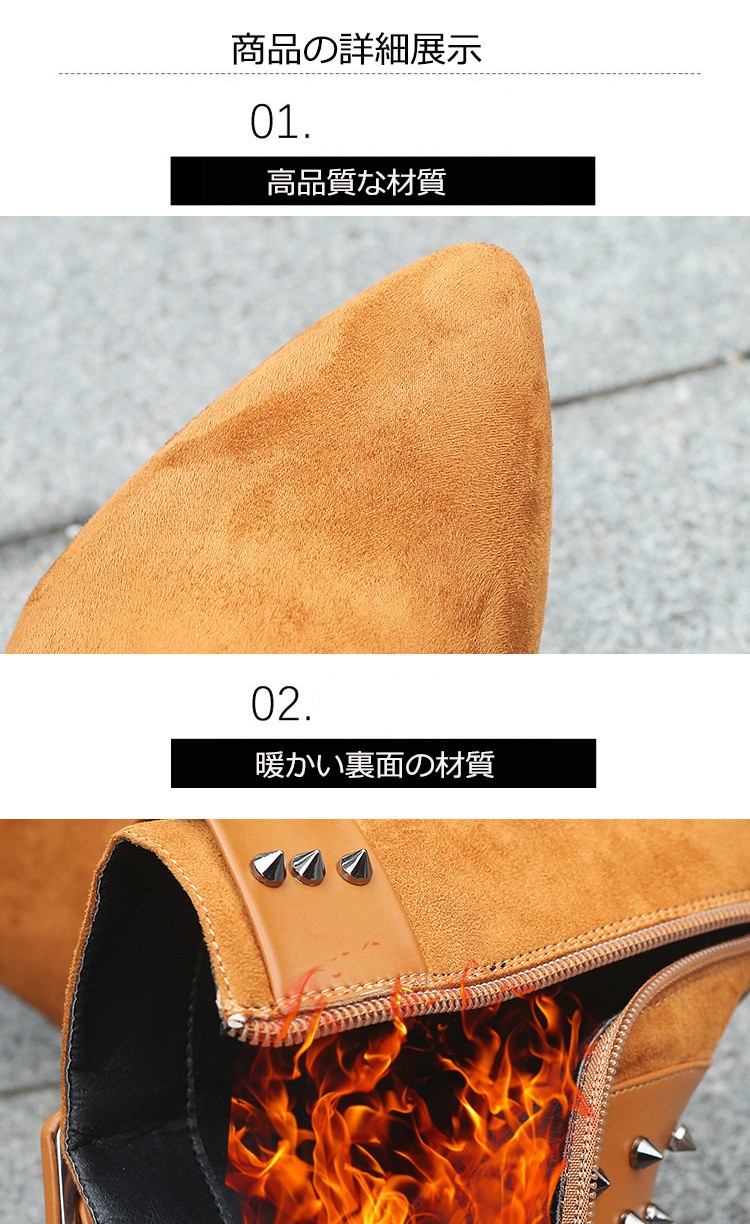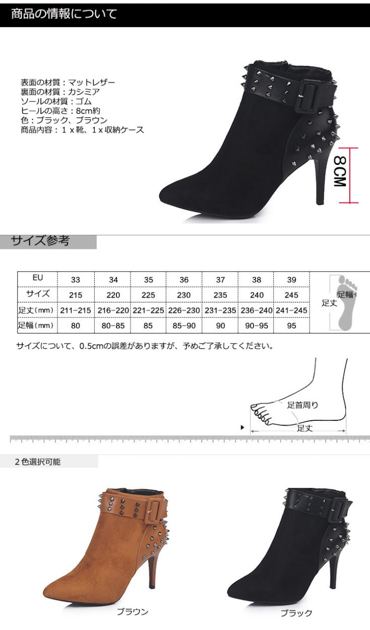 表面の材質:マットレザー裏面の材質:カシミアソールの材質:ゴムヒールの高さ:8cm約色:ブラック、ブラウンサイズ:22~24.5cm約商品内容:1x靴,1x収納ケースサイズ:34:22cm 35:22.5cm 36:23cm 37:23.5cm 38:24cm 39:24.5cm 40:25cmショートブーツレディース ヒール 女性のアンクルブーツ シューズ ファスナー式靴 秋冬物 シンプル くつレディース用のアンクルブーツが登場ハイヒールの靴なので、美脚ですカラーもシルエットもとても組み合わせしやすくて、どんな場合にも使える上品な一足
