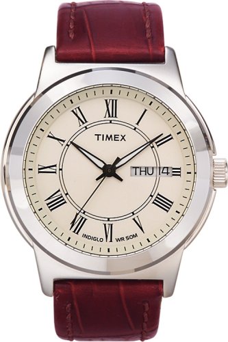 Classic watch with Indiglo nightlight featuring clean white dial with day/date window and elegant Roman numeral markers