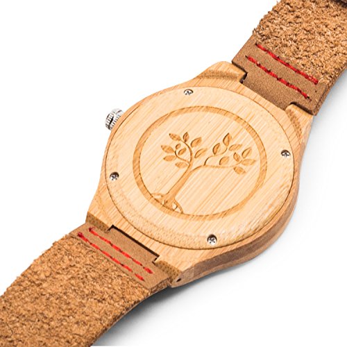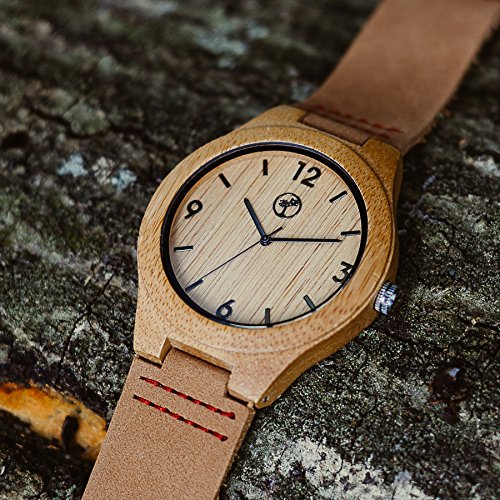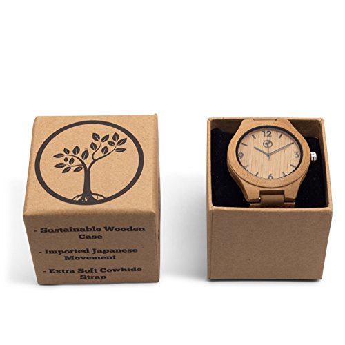 Wooden Watch for Men by Tree People - Bamboo Wood Case, Genuine Cowhide Leather Watch Strap, Analog Display Miyota Quartz Movement, Gift Box The beautiful and unique qualities of your new wooden watch are guaranteed to delight you for many years to come. You're sure to enjoy this unique and beautiful Bamboo Wooden Watch for Men by Tree People! The bamboo used in our handmade watches will mature and become even more striking the longer you wear it. This elegant timepiece comes with a removable band so you can customize your look however you may like. This Tree People Men's Watch contains a precise Japanese Miyota quartz watch movement, which is regarded as one of the world's best, with up to 5 long years of battery life.