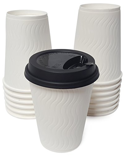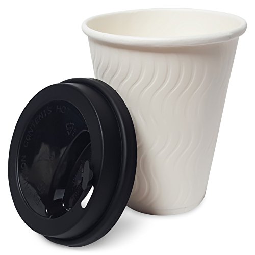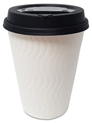 STYLISH AND ELEGANT DESIGN: Our Package Contains 100 DOUBLE WALLED 12oz White Ripple Coffee Cups and Secure Reclosable Matte Black Lids with FREE STIRRERS.