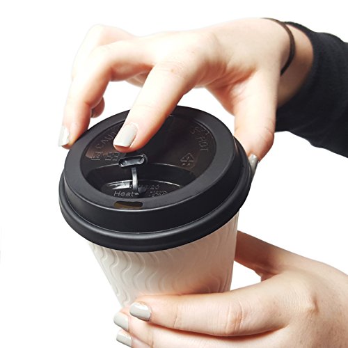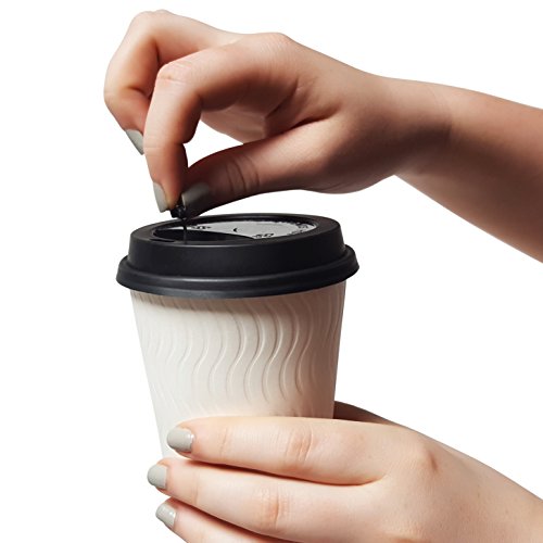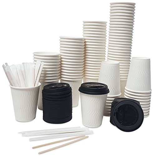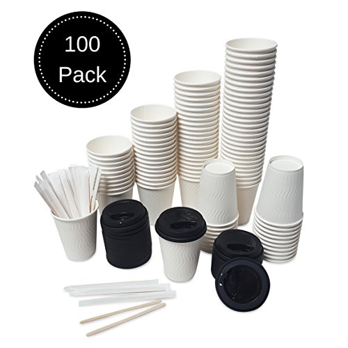 Pack of 100 - Premium Disposable Paper Coffee Cups with Reclosable Lids, Stirrers Included - 12 Ounce - Perfect for Offices, Party Events, Shops and Travel