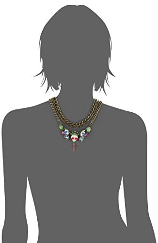 brass tone necklace chains with multi charms including ivory skulls with crystal accented crowns and cross, faceted floral oval-shaped beads, magenta faceted beads and green shell beads Imported Items that are handmade may vary in size, shape and color Made in China Brand : Betsey Johnson Item model num : B09849-N01 MPN(PartNumber) : B09849-N01 EAN : 0885043999340