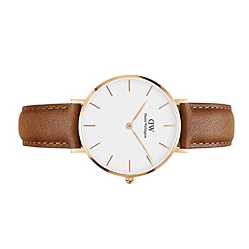 Rose gold-tone stainless steel case with a light brown leather strap. Fixed rose gold-tone bezel. Eggshell white dial with rose gold-tone hands and index hour markers. Dial Type: Analog. Quartz movement. Scratch resistant mineral crystal. Pull / push crown. Solid case back. Case size: 32 mm. Case thickness: 6 mm. Round case shape. Band width: 14 mm. Tang clasp. Water resistant at 30 meters / 100 feet. Functions: hour, minute. Casual watch style. Daniel Wellington Classic Petite St Mawes Ladies Watch DW00100172.Feature