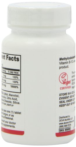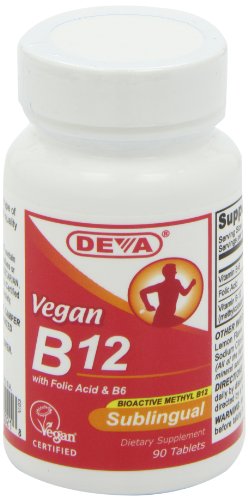 -. Binding : Health and Beauty -. Brand : Deva Vegan Vitamins -. EAN : 0895634000218 -. Feature : DEVA Vegan B12 Sublingual is 100% animal free, and guaranteed for purity / It is an especially important vitamin for maintaining healthy nerve cells / Vitamin B12 is a water-soluble vitamin that is stored in the liver / DEVA Sublingual Vitamin B-12 contains 100% Daily Value of Folic Acid and Vitamin B-6 -. IsAdultProduct : 0 -. Label : Deva Vegan Vitamins -. Manufacturer : Deva Vegan Vitamins -. MPN : 895634000218 -. NumberOfItems : 2 -. PackageQuantity : 2 -. PartNumber : 895634000218 -. ProductGroup : Health and Beauty -. ProductTypeName : HEALTH_PERSONAL_CARE -. Publisher : Deva Vegan Vitamins -. ReleaseDate : 2015-06-22 -. Size : 1000 mg -. Studio : Deva Vegan Vitamins -. Title : Deva Vegan Vitamins Sublingual B-12, 90 Tablets (Pack of 2) -. UPC : 895634000218