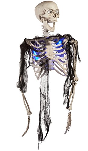 -. Feature : Light up item / 17 x 23 / Creepy skeleton / 90 percent plastic, 10 percent polyester / Batteries included